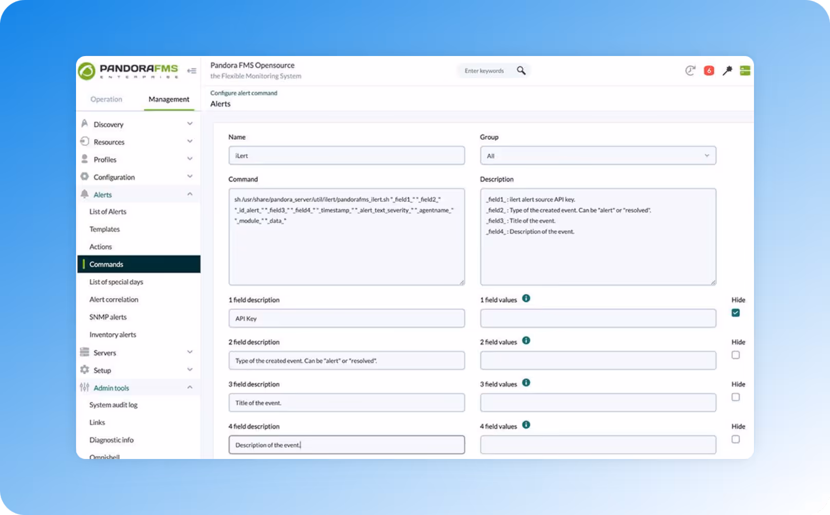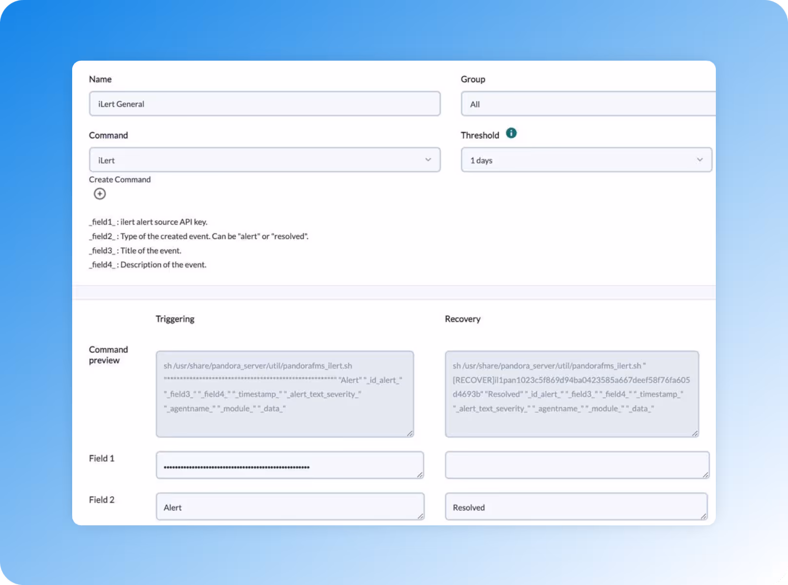 To create an ilert notification with Pandora FMS, follow these three steps: Create a command, an action, and associate an alert template with that action.