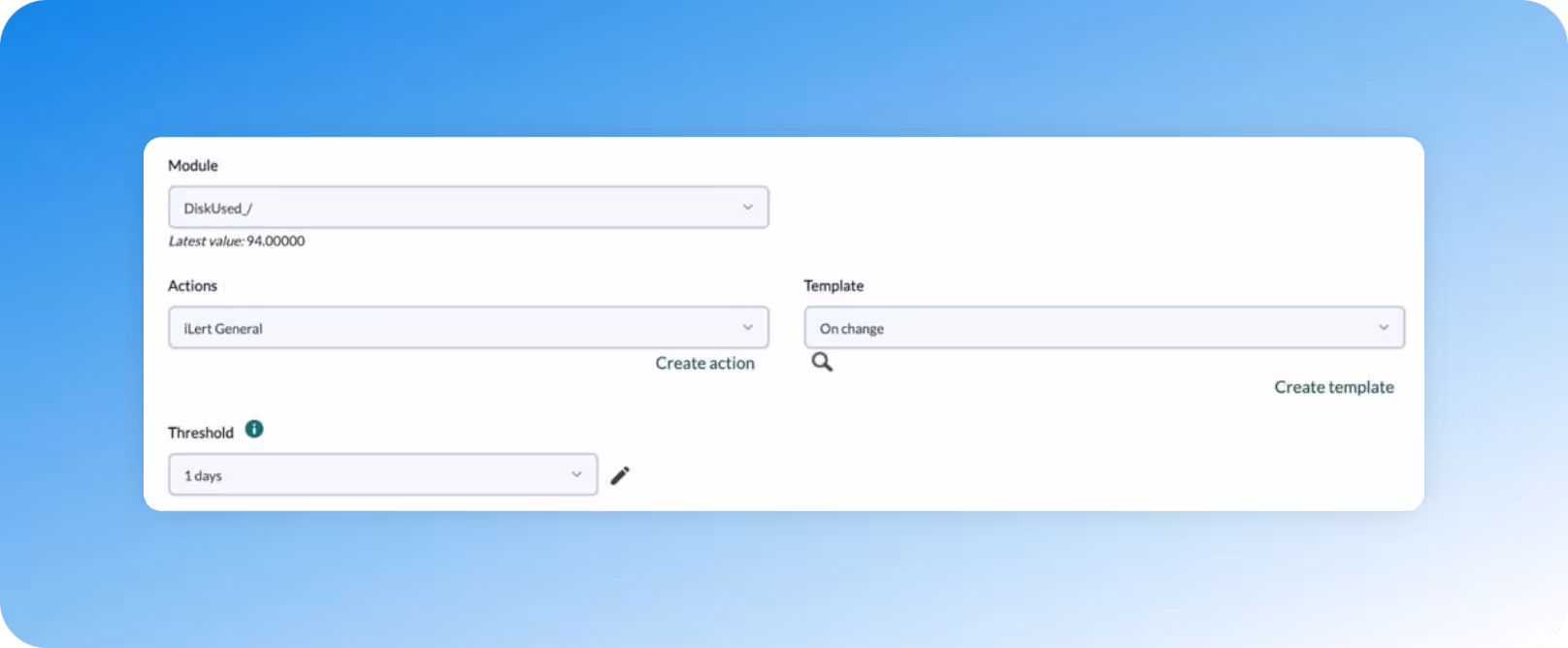 Create an alert about a module (in this example, a disk one) that uses your command through the newly created action: