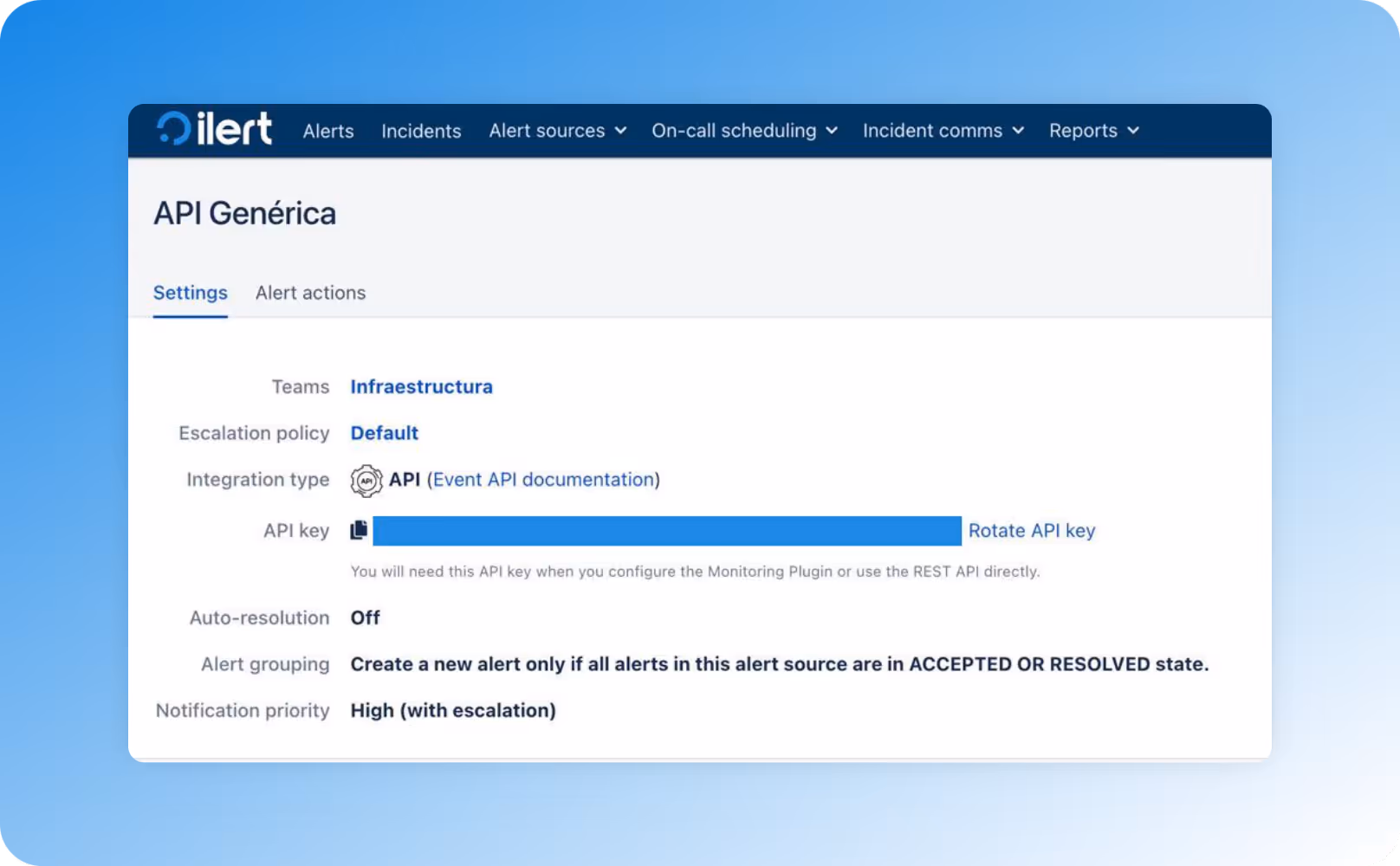 Now it's time to "connect" your Pandora FMS with ilert; for that you will need the API Key. You may use ilert in any Pandora FMS version (even the older ones), but since version 775, it already comes "as standard" integrated into the action system. We are going to describe how to implement it from scratch, perfect if your version is older. If you already use a Pandora FMS 775 or higher, you may skip almost all of the following steps (command creation, action creation), and you may directly edit the action that comes by default with Pandora FMS for ilert to set the API Key generated in the previous step.