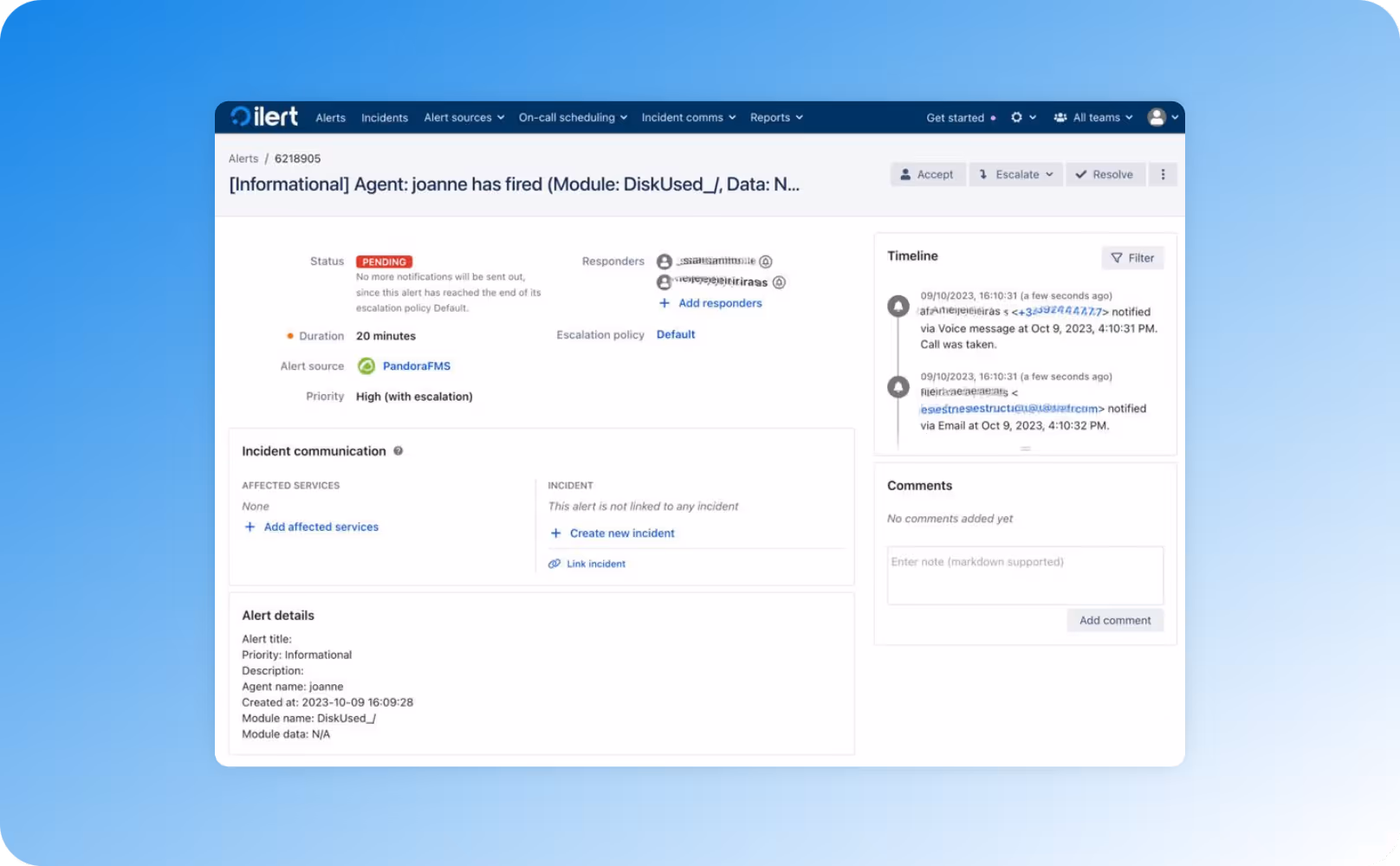 ilert can also be integrated with your ITSM or used to enrich alerts. It can also be integrated with Pandora ITSM.