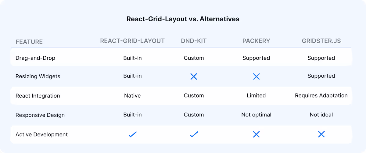 After carefully evaluating each option, React-Grid-Layout emerged as the most complete and efficient solution for our requirements. We chose React-Grid-Layout for its built-in drag-and-drop functionality, seamless React integration, active maintenance, and efficient grid support, which saved time and reduced complexity. Its performance and stability met our needs for interactive, data-heavy dashboards with minimal optimization required.