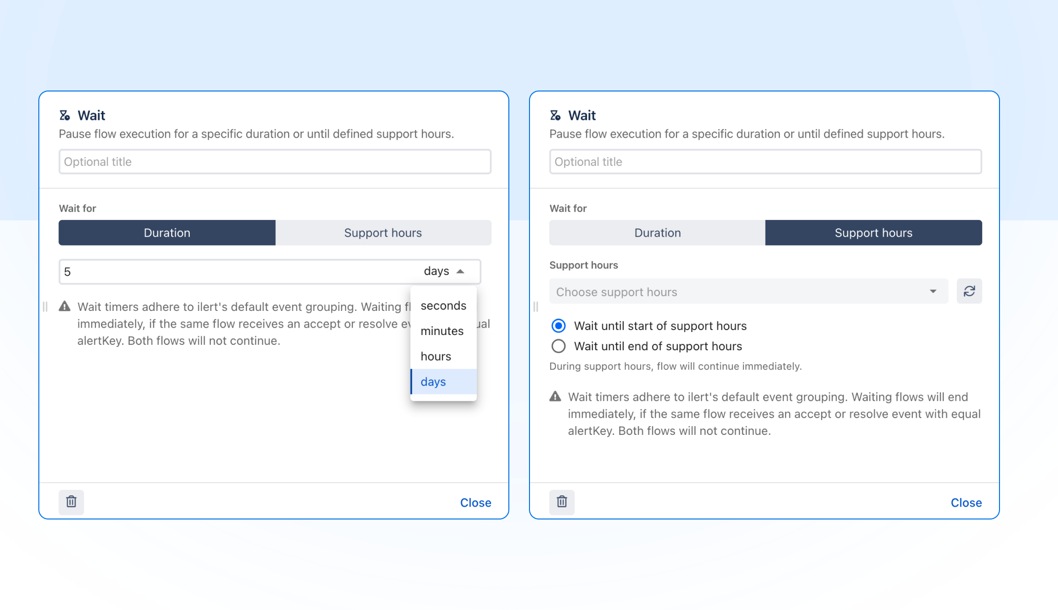Event flows can now pause and resume based on your configured support hours, so routing logic respects when your team is actually available, not just whether a condition is met. Wait durations can also now be set in days, extending the previous limit of hours.