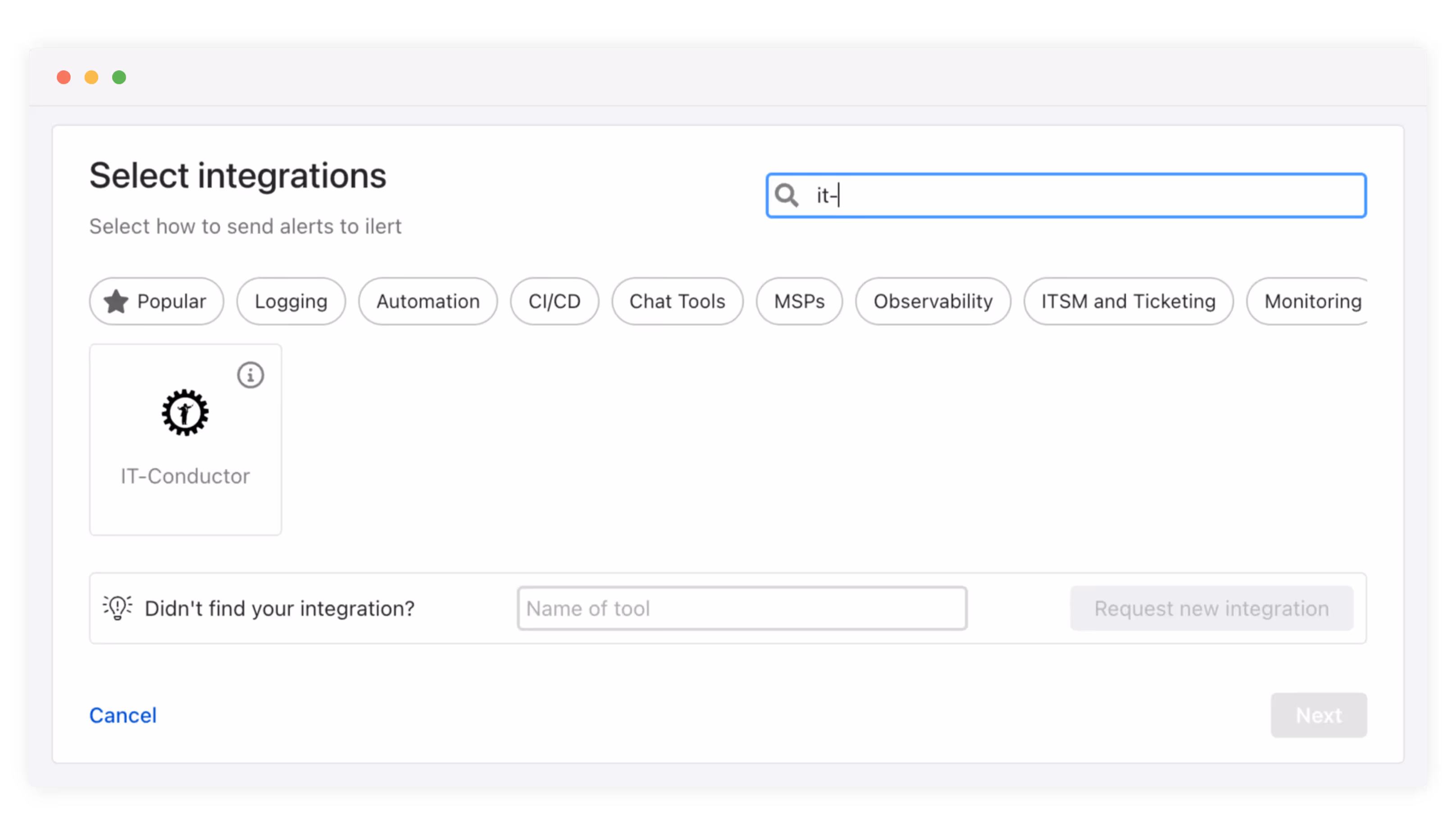 In IT-Conductor navigieren Sie zum Integrationsbereich, suchen nach ilert und erstellen eine neue Integration, indem Sie die zuvor gespeicherte Webhook-URL hinzufügen.