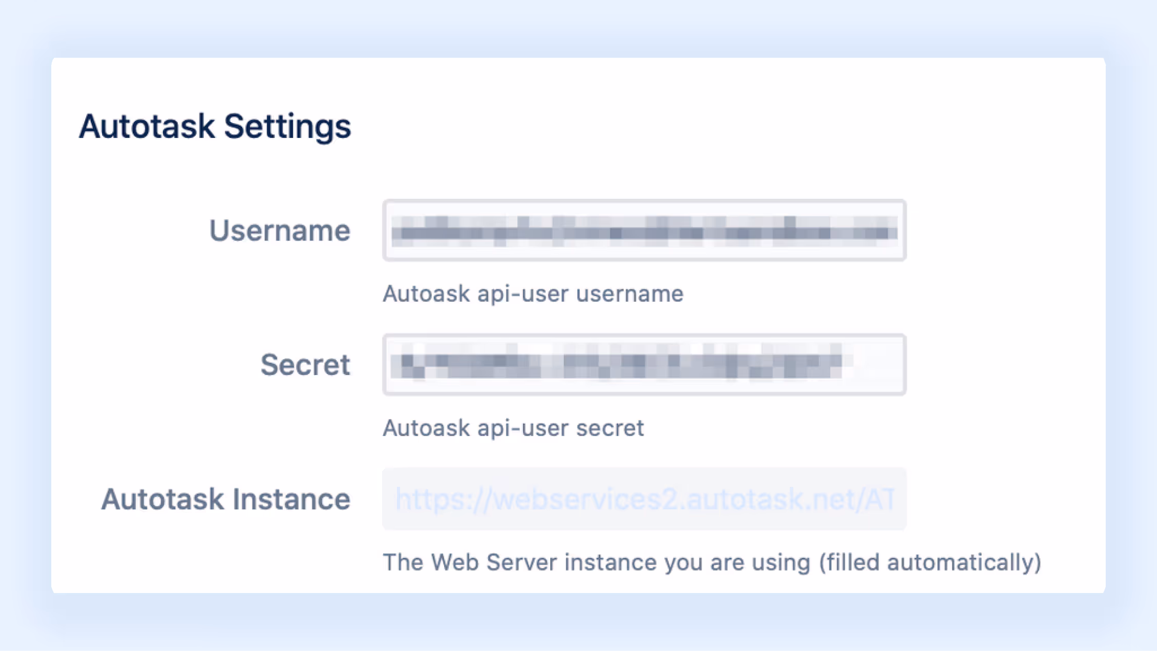 - Wenn Sie nach Ihren Autotask-Anmeldeinformationen gefragt werden, geben Sie den „Benutzernamen“ und das „Geheimnis“ ein, die Sie gerade in einem der vorherigen Schritte in Autotask erstellt haben. ilert erkennt automatisch den richtigen Webdienst für Autotask, abhängig von Ihrer Eingabe.