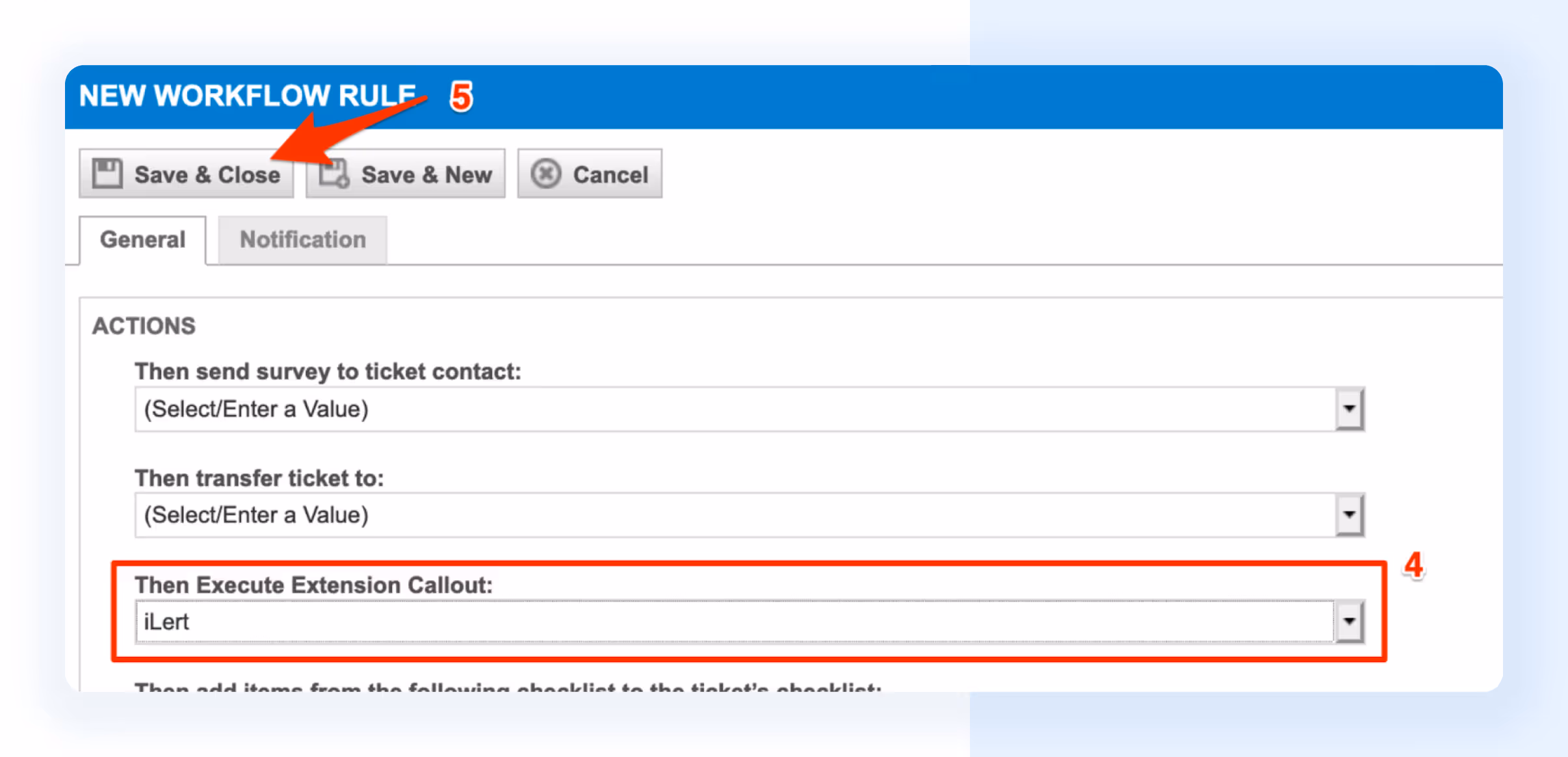- Scrollen Sie zum Abschnitt „Aktionen“ herunter und wählen Sie bei der Option „Dann Extension Callout ausführen“ Ihr Autotask Callout aus, das Sie in einem vorherigen Schritt erstellt haben.