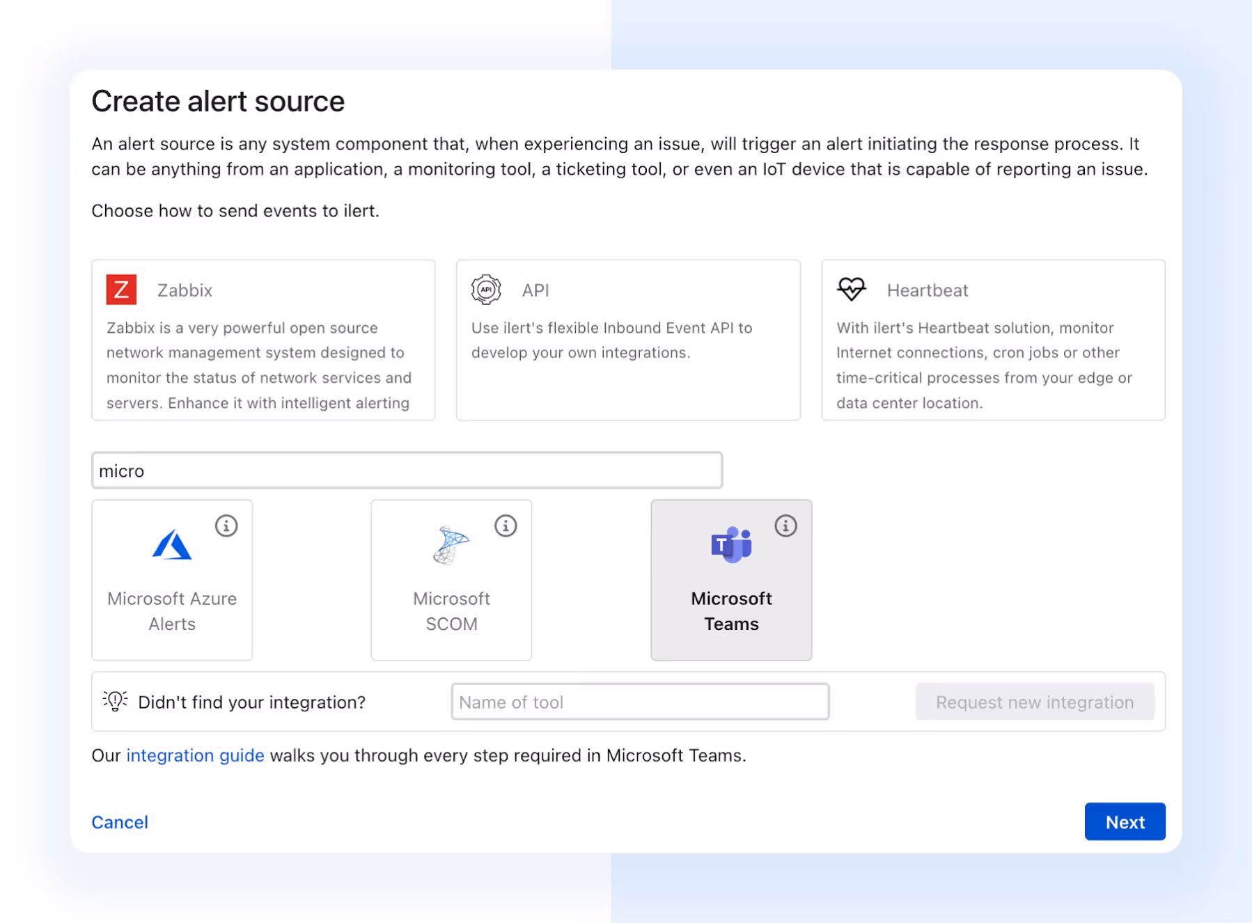 Lassen Sie uns die fehlenden Lücken von Microsoft Teams zur ilert-Alarmquelle und in Autotask PSA schließen. Zunächst gehen Sie zu Ihrem ilert-Konto und erstellen eine neue Alarmquelle. Wählen Sie diesmal, statt Autotask, Microsoft Teams aus.