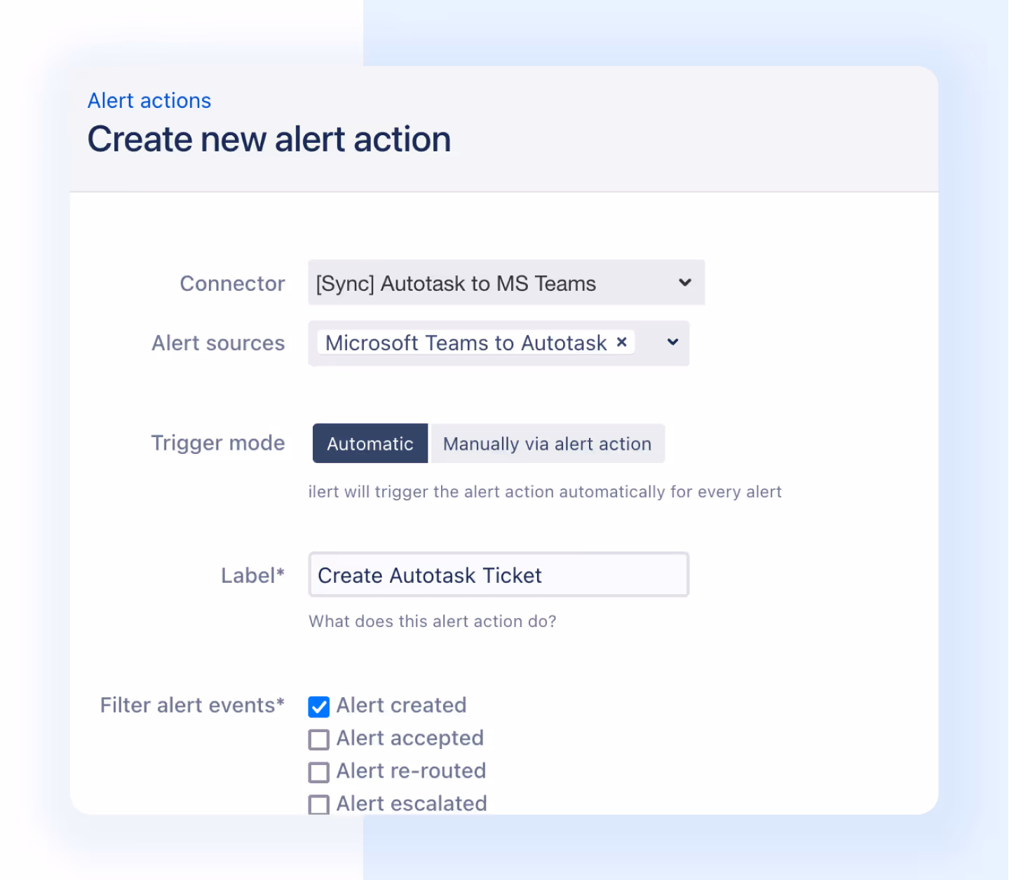 - Automatisierte Arbeitsabläufe: Automatisieren Sie die Erstellung von Vorfällen in Autotask PSA aus Alarmen durch den ilert Teams Bot, um manuelle Arbeitslasten zu reduzieren.