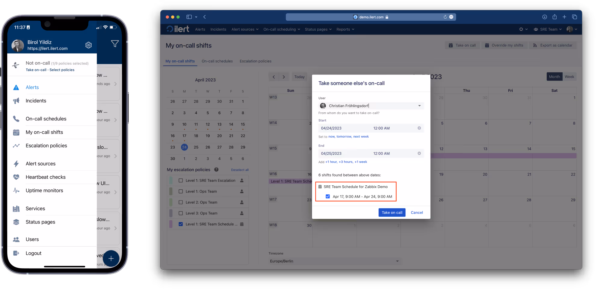 - Take on-call widget in the mobile app: A dedicated widget within the mobile app makes it simple to see the current on-call status and take over a colleague's on-call shift when necessary.